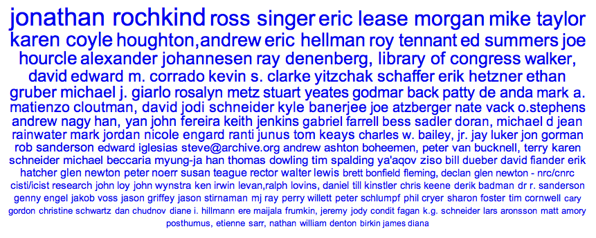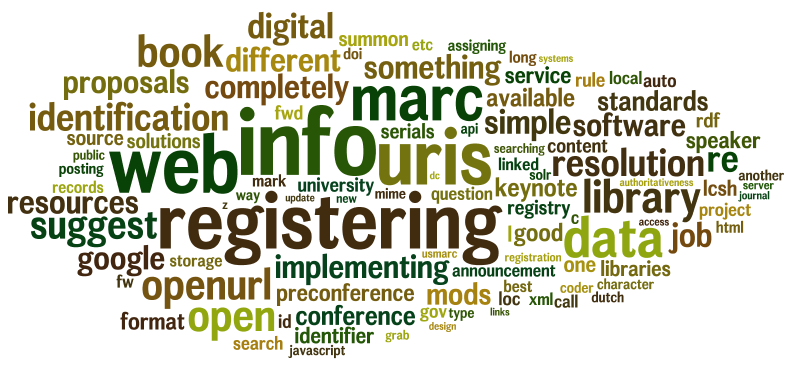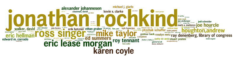 The keynote address, Critical collaborations: Programmers and catalogers? Really?, was given by Diane Hillman (Metadata Management). In it she advocated greater collaboration between the catalogers and coders. “Catalogers and coders do not talk with each other. Both groups get to the nitty-gritty before their is an understanding of the problem.” She said change needs to happen, and it should start within our own institutions by learning new skills and having more cross-departmental meetings. Like Wheeler, she had her own set of tensions: 1) “cool” services versus the existing online public access catalog, and 2) legacy data versus prospective data. She said both communities have things to learn from each other. For example, catalogers need to learn to use data that is not created by catalogers, and catalogers need not always look for leadership from “on high”. I asked what the coders needed to learn, but I wasn’t sure what the answer was. She strongly advocated RDA (Resource Description and Access), and said, “It is ready.” I believe she was looking to the people in the audience as people who could create demonstration projects to show to the wider community.