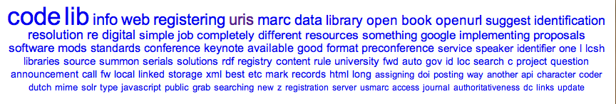 Karen Coombs (OCLC) gave the next presentation, Visualizing library data. In it she demonstrated a number of ways library information can be graphed through the use of various mash-up technologies: 1) a map of holdings, 2) QR codes describing libraries, 3) author timelines, 4) topic timelines, 5) FAST headings in a tag cloud, 6) numbers of libraries, 7) tree relationships between terms, and 8) pie charts of classifications. “Use these things to convey information that is not a list of words”.