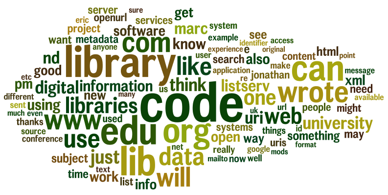 The Code4Lib community has a lot to offer the wider library profession. If the use of computers in libraries is only going to grow (which is an understatement), then a larger number of people who practice librarianship will need/want to benefit from Code4Lib’s experience. Yet the existing Code4Lib community is reluctant to change the format of the conference to accomodate a greater number of people. Granted, larger numbers of attendees make it more difficult to find venues, enable a single shared conference experience, and necessitates increased governance and bureaucracy. Such are the challenges of a larger group. I think the Code4Lib community is growing and experiencing growing pains. The mailing list increases by at least one or two new subscribers every week. The regional Code4Lib meetings continue. The journal is doing just fine. Code4Lib is a lot like the balance of the library profession. Practical. Accustomed to working on a shoe string. Service oriented. Without evolving in some way, the knowledge of Code4Libbers is not going to have a substancial effect on the wider library community. This makes me sad.